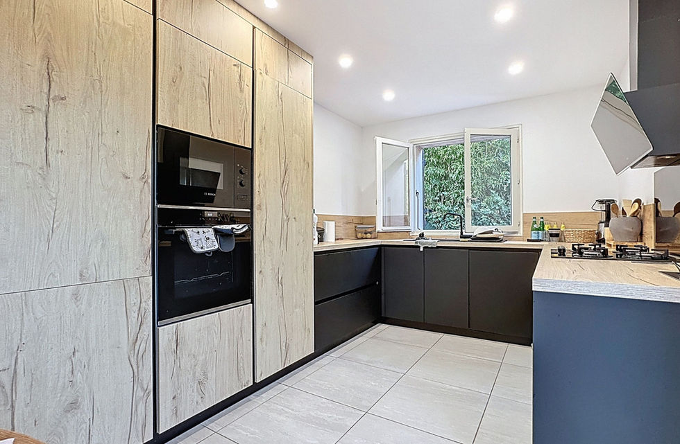 La cuisine indépendante de 14 m², aménagée avec des matériaux de qualité, allie élégance et praticité.